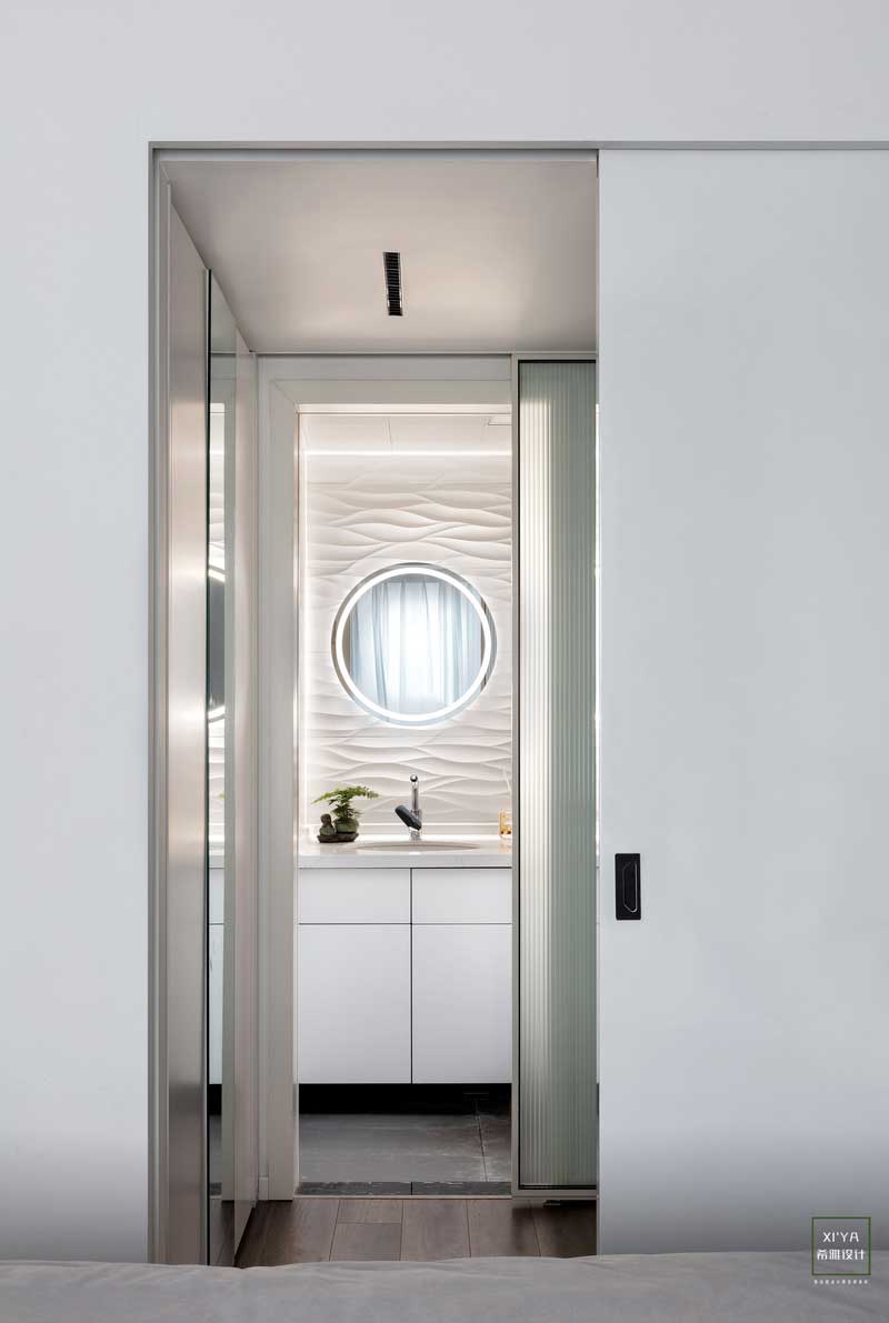 過道的設計,無頂式無多余裝飾的墻頂,用纖細的光影燈條,來詮釋一種光影靈動,線條活躍,直擊人心的動心,和立體韻味,賦予了整條過道一種全新的生命力。